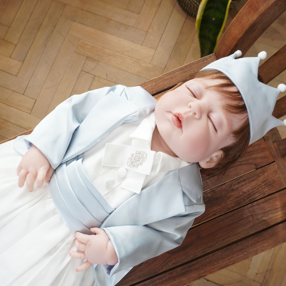 お宮参り、100日祝いにぴったりのタキシード風セレモニードレスです。