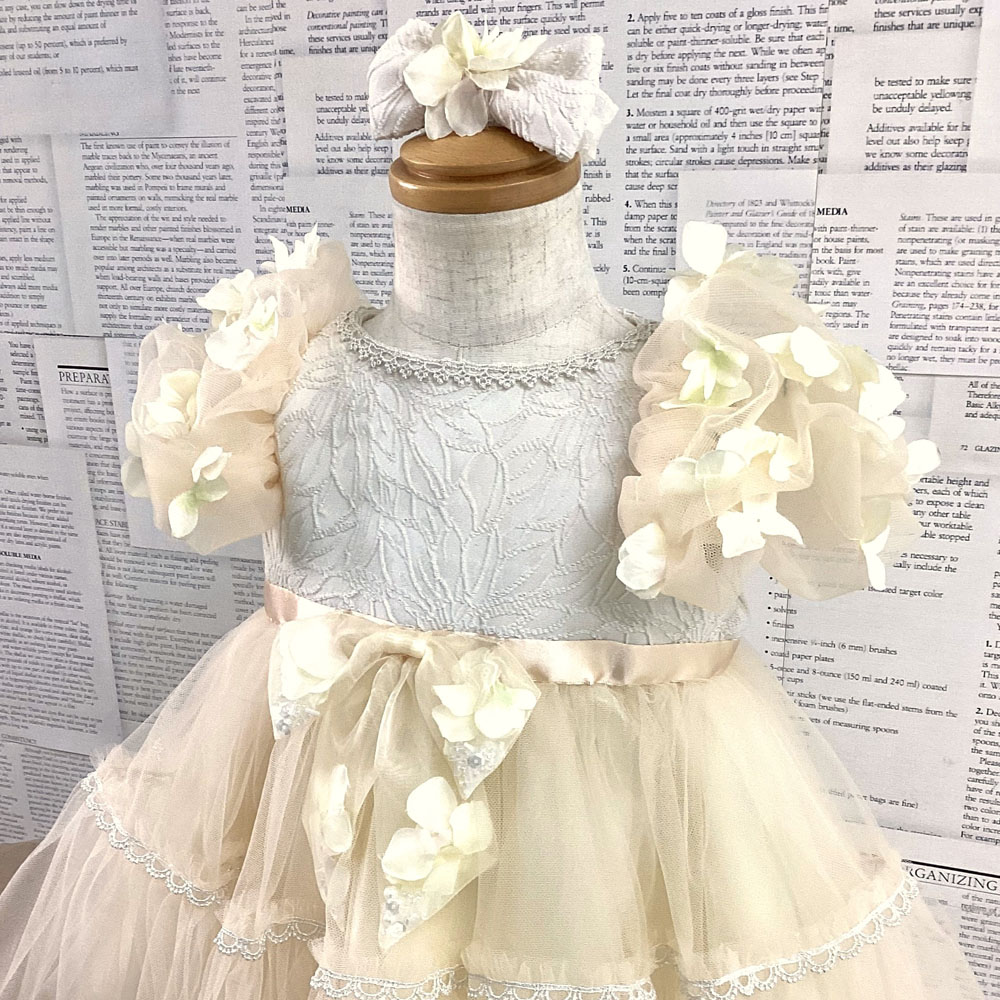 高級感のあるアメリア柄のジャガードを身頃に使用し、ふわふわのチュールのパフスリーブには沢山の花びらをあしらって華やか1着に。