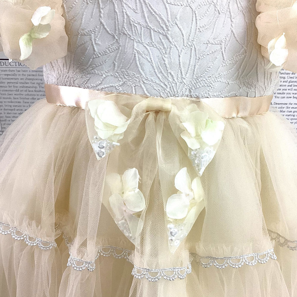 ウエストにレイアウトした透明感のあるオーガンジーリボンの中には、花びらやスパンコール・ビーズを入れ可愛く仕上げました。