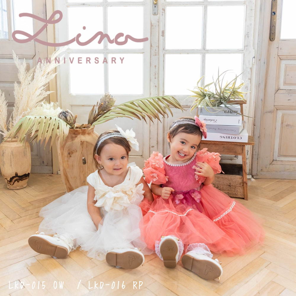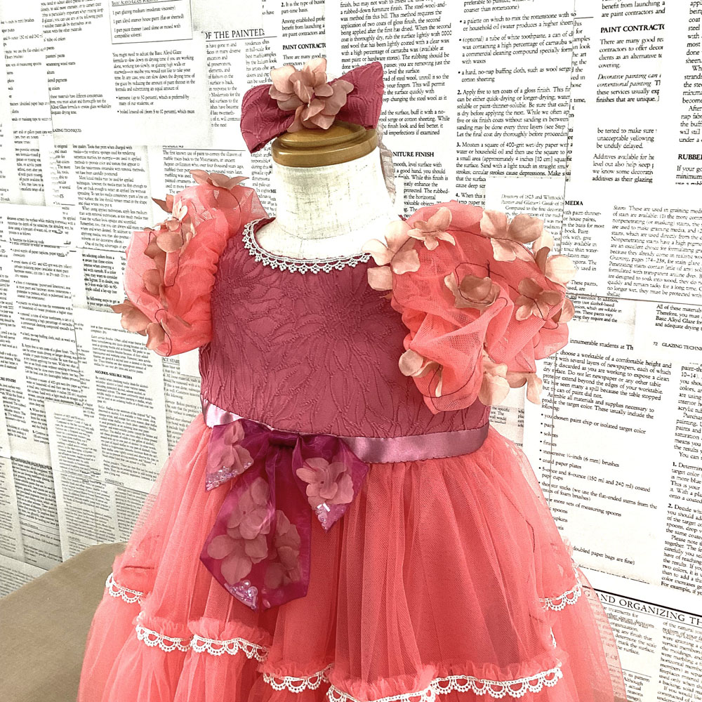 高級感のあるアメリア柄のジャガードを身頃に使用し、ふわふわのチュールのパフスリーブには沢山の花びらをあしらって華やか1着に。