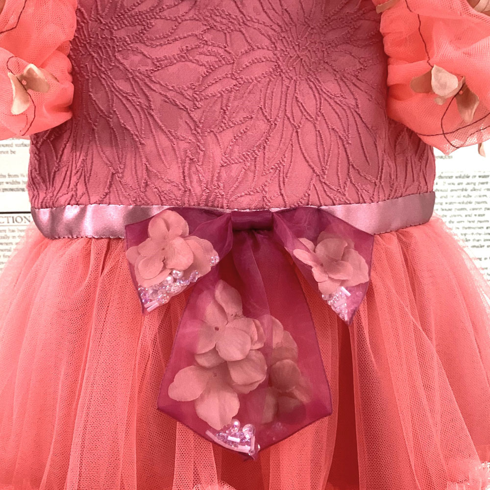 ウエストにレイアウトした透明感のあるオーガンジーリボンの中には、花びらやスパンコール・ビーズを入れ可愛く仕上げました。