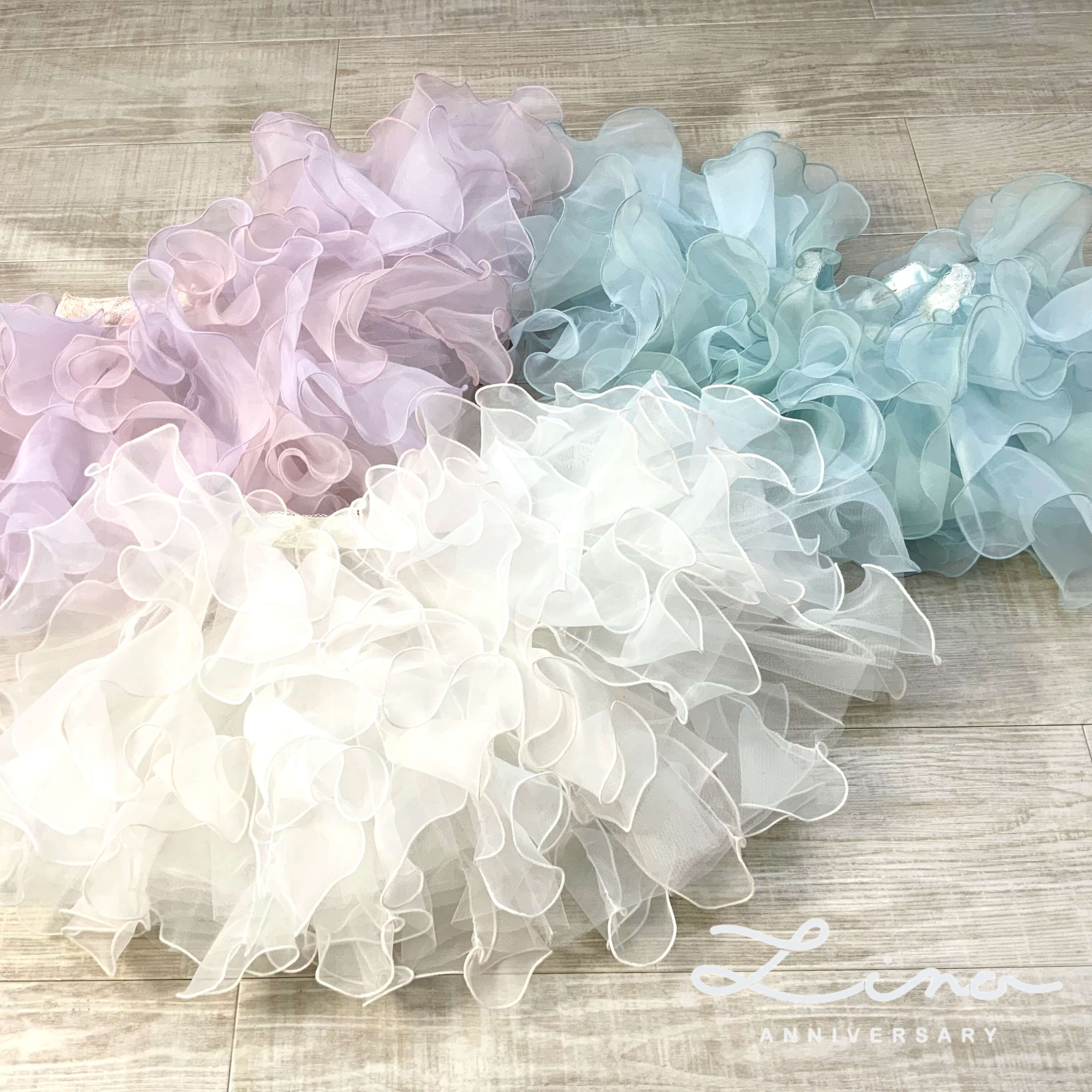 オーガンジーのたてフリルが断然キュートなオーバースカートです。2色のオーガンジーでより透明感と奥行きをアップさせています。サーキュラースカートでおすわりカットも華やかなボリュームです。オーバースカートは簡単にリボン結びをしていただくだけなので、お手軽に着用することが出来ます。アレンジ撮影のアイテムにお使いいただけます。