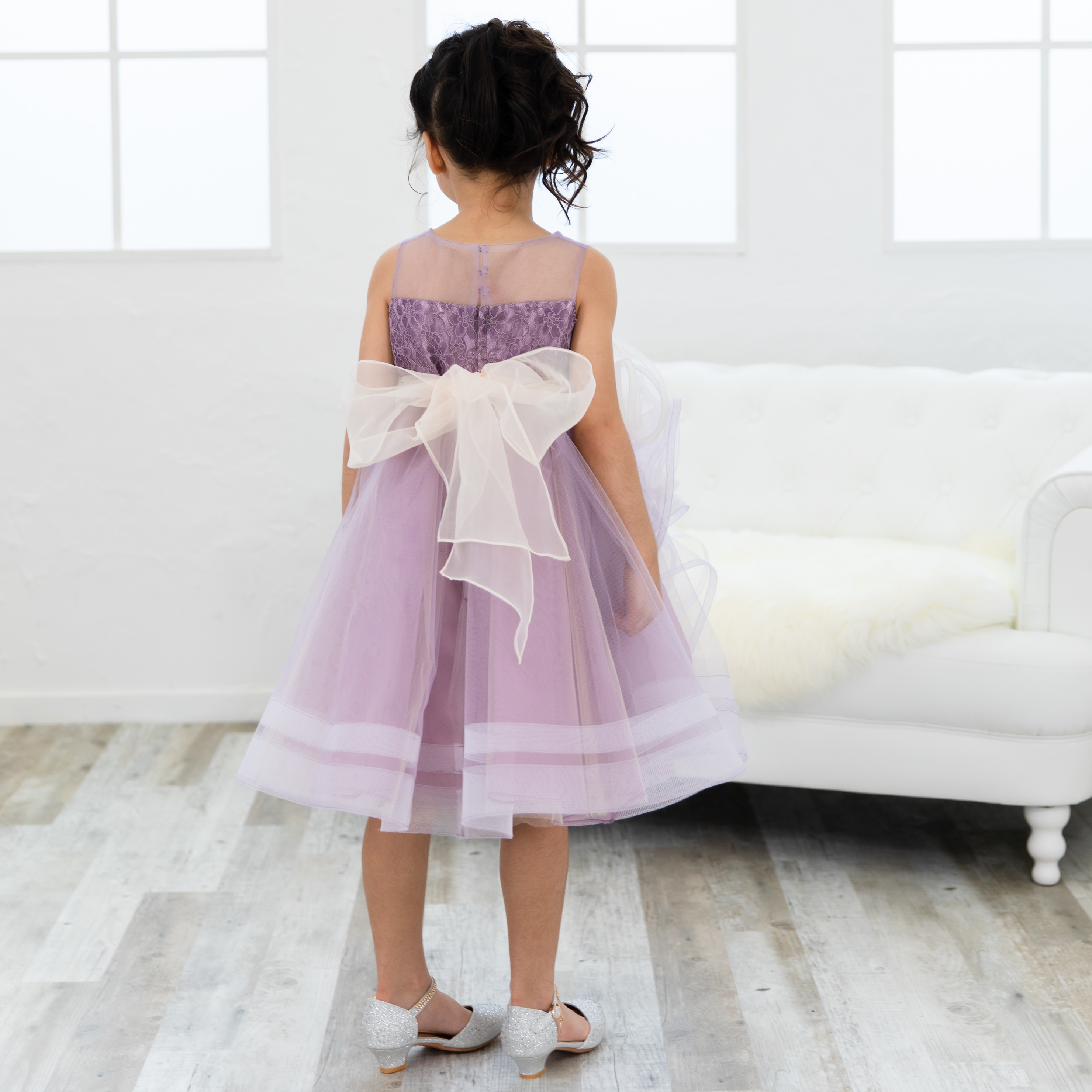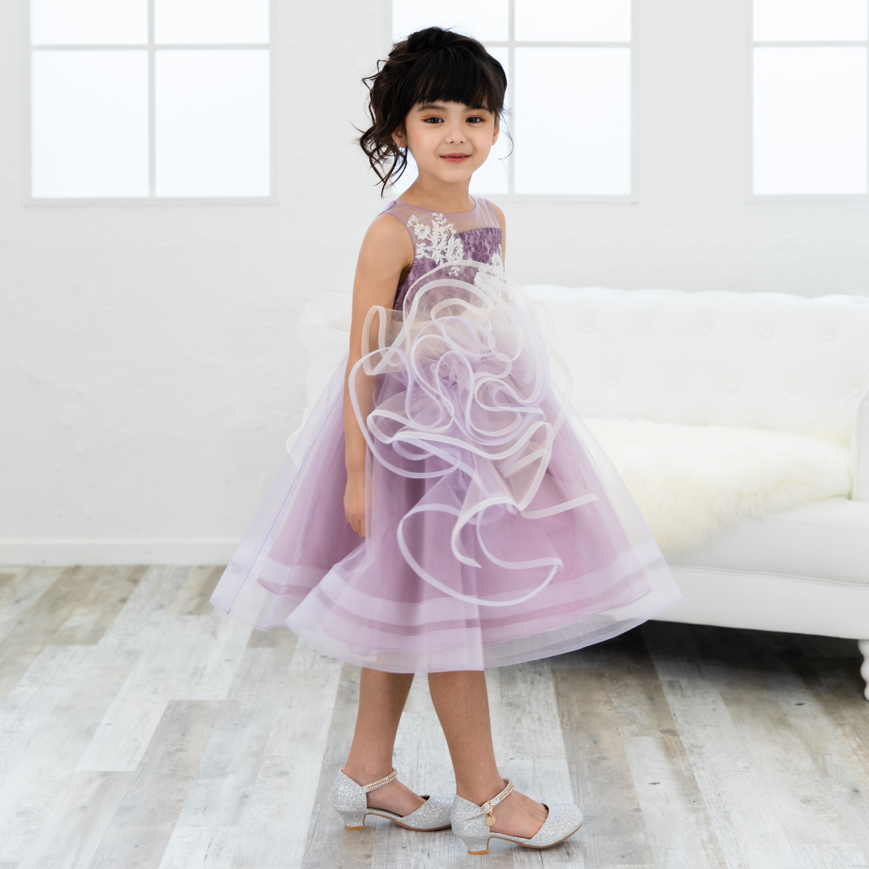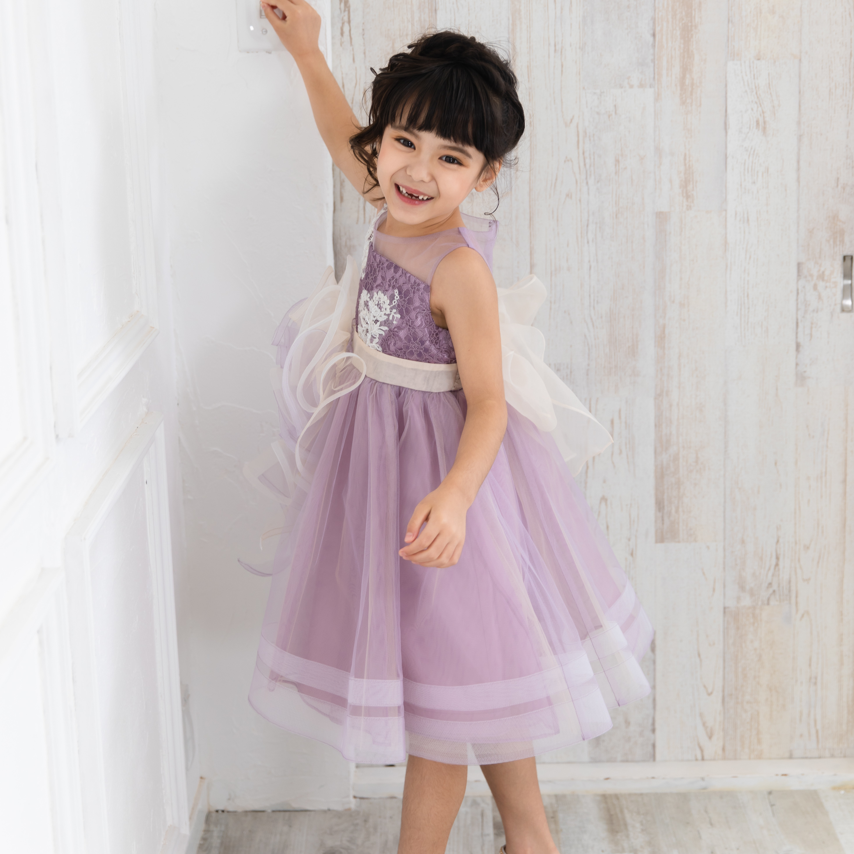ラベンダーのチュールで軽やかに仕立てた膝下丈のドレスです。