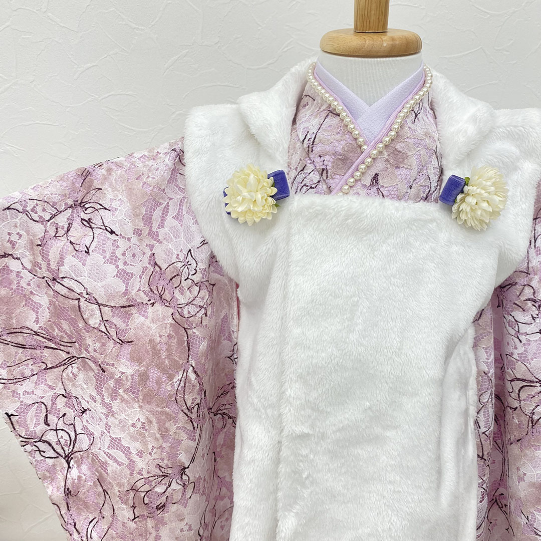 パステルカラーの濃淡ぼかしプリントにハンドメイド風の繊細な花柄を描いた綺麗なラッセルレースを着物に仕立てました。